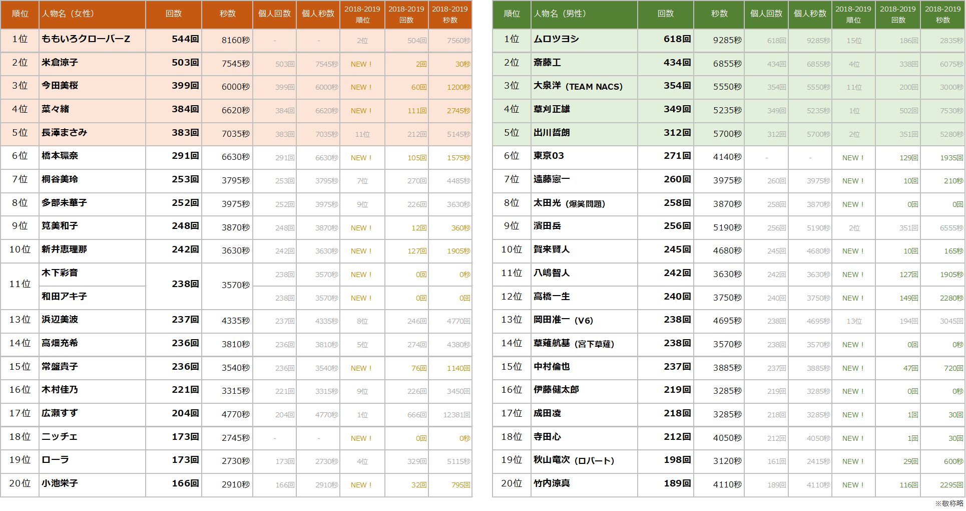 放送回数トップはももいろクローバーZさん、ムロツヨシさん!