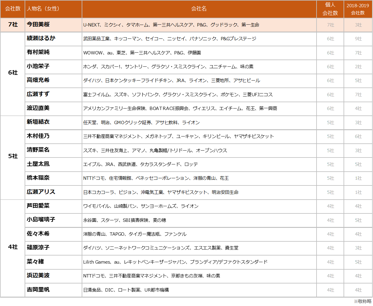 ※ 会社数ランキングは、エム・データ独自の基準で収集・登録した会社名に基づき、タレントの契約期間や契約社数ではなく、調査期間内で放送されたタレントが出演しているTV-CMの会社数を集計しています。