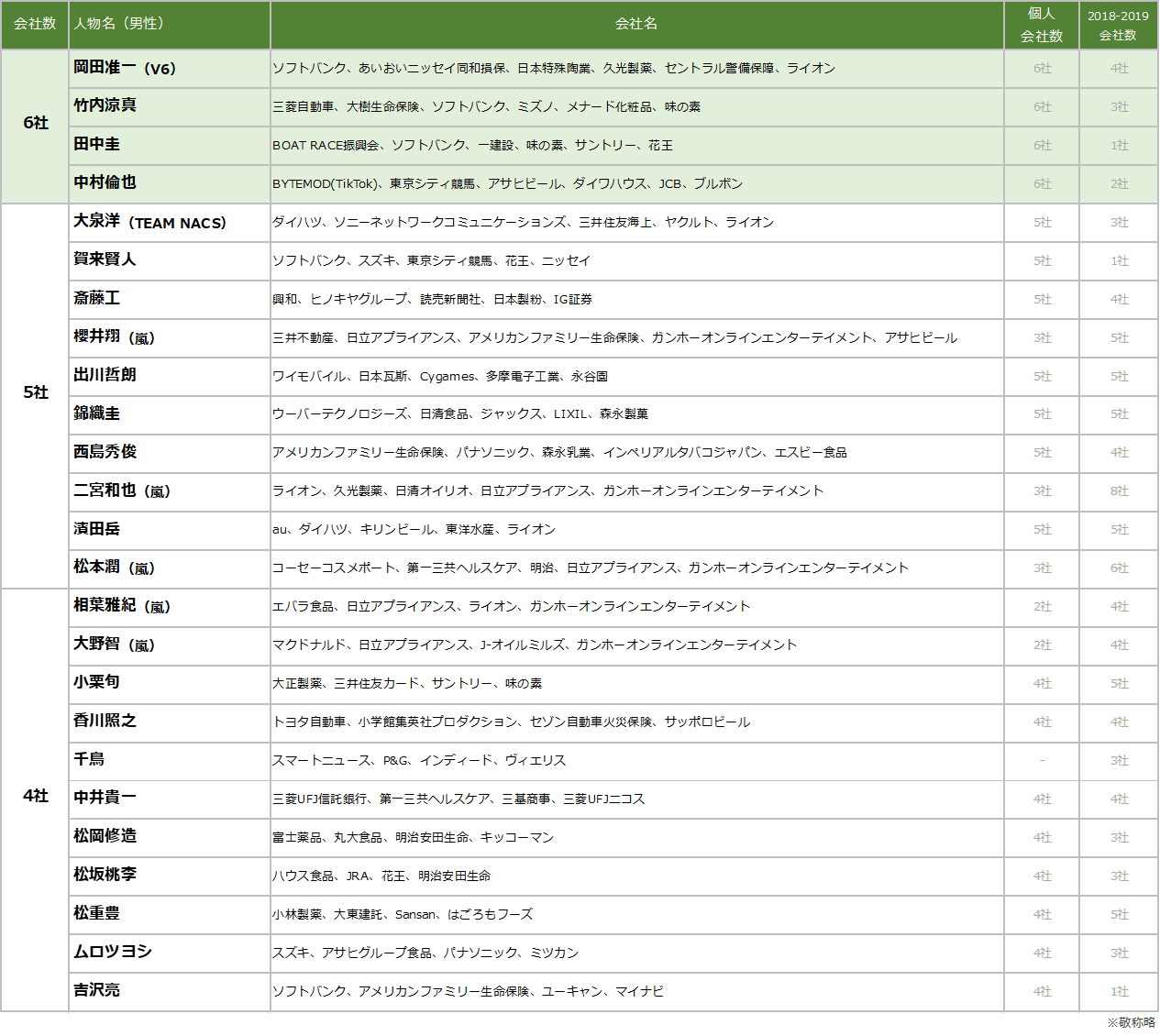 会社数トップは今田美桜さん、岡田准一(V6)さん、竹内涼真さん、田中圭さん、中村倫也さん!