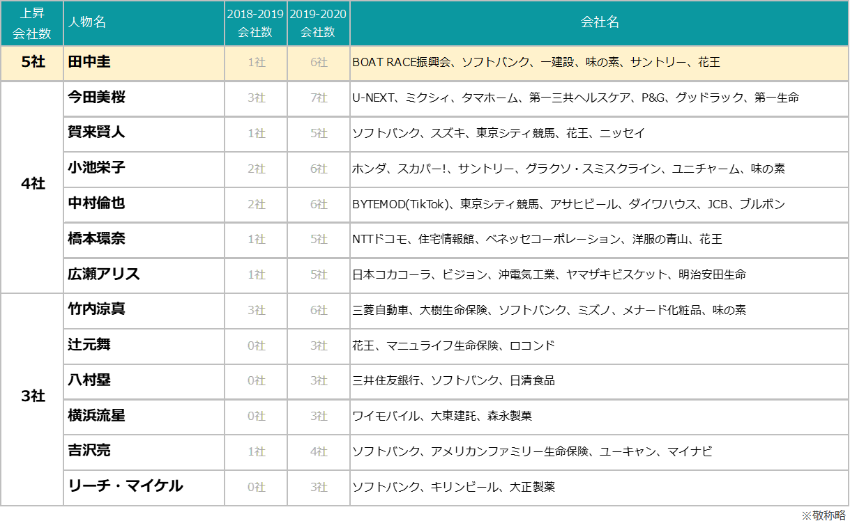 - 調査対象:日本テレビ、テレビ朝日、TBS、テレビ東京、フジテレビ(東京地区地上波キー局)で放送されたTV-CMに出演・登場した人物を対象。
