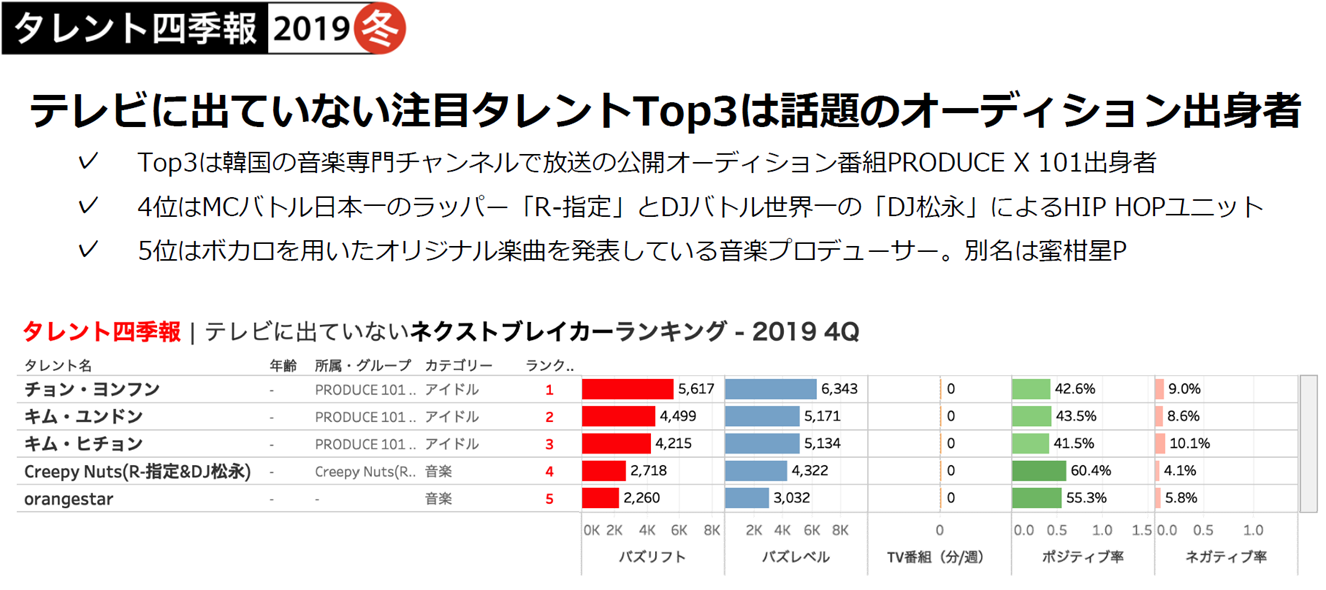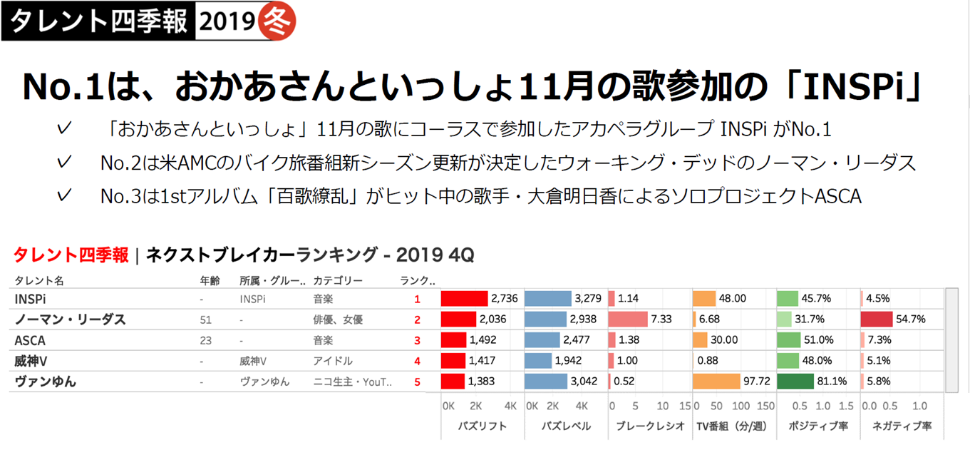 テレビの放送内容をテキスト化した「TVメタデータ」を提供する株式会社エム・データ(本社:東京都港区、代表取締役: 関根俊哉)と、エム・データ内のビッグデータ解析プロジェクト「ライフログ総合研究所(Life Log Lab. 略称“L3”)」(所長:梅田仁)は、タレントパワーを可視化する「Talent Rank(※1)」から、四半期毎にレポーティングするサービス「タレント四季報 2019冬(10-12月号)」を発表し、販売を開始しました。