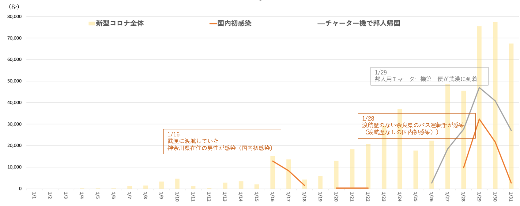 ■1月(コロナの話題の中心はまだ日本国外) :「国内初感染者」→「チャーター機で邦人帰国」
