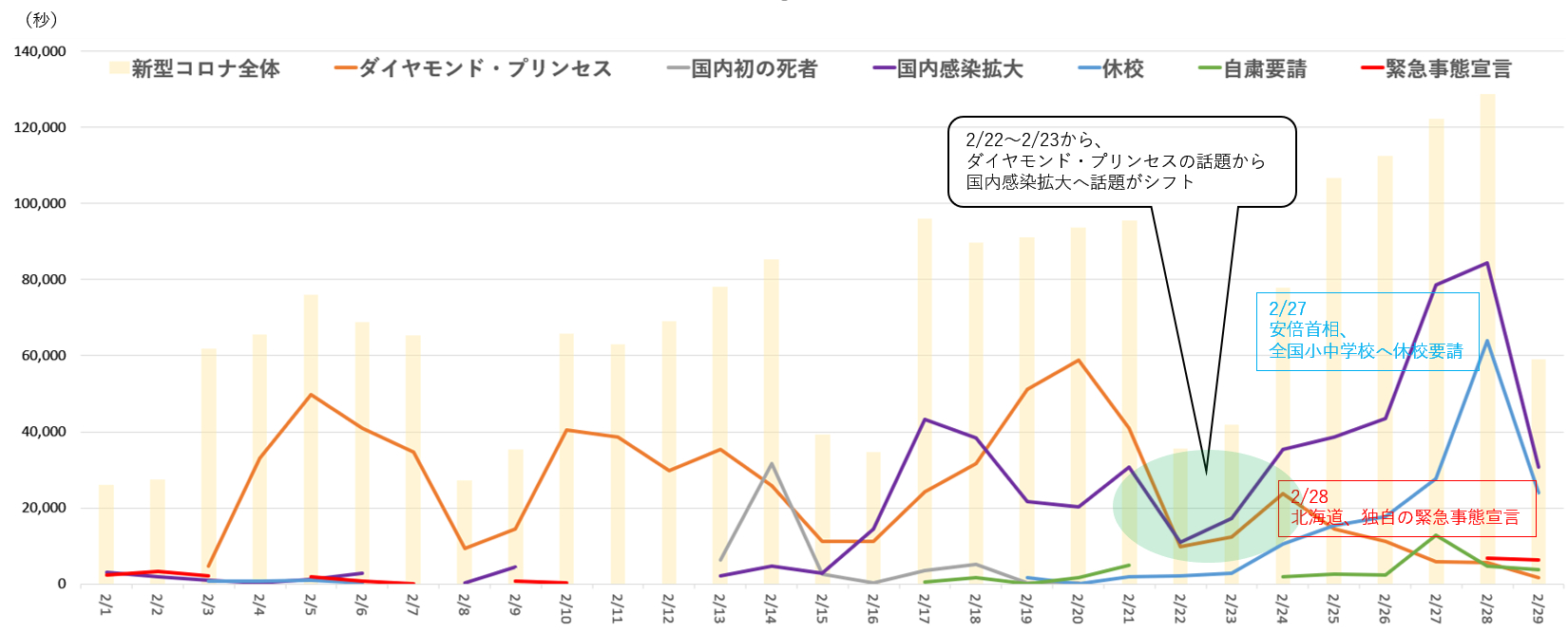 ■2月(話題の中心がクルーズ船から国内感染者拡大へと全国的なものに変化):「ダイヤモンド・プリンセンス」→「国内感染拡大」→「一斉休校」