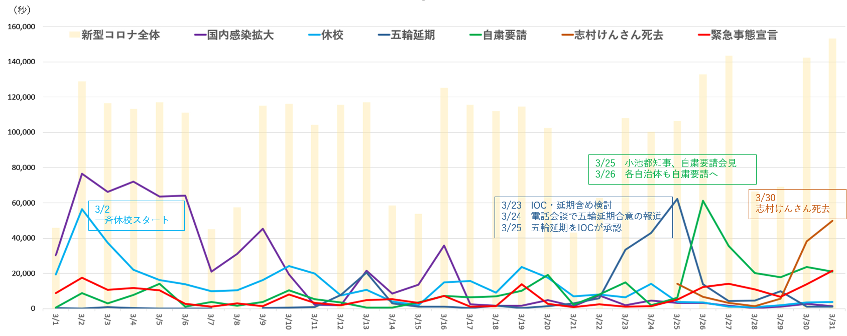 ■3月(五輪延期決定から自粛ムードと危機感が加速):「国内感染拡大」→「東京五輪延期」→「自粛要請会見」→「志村けんさん死去」
