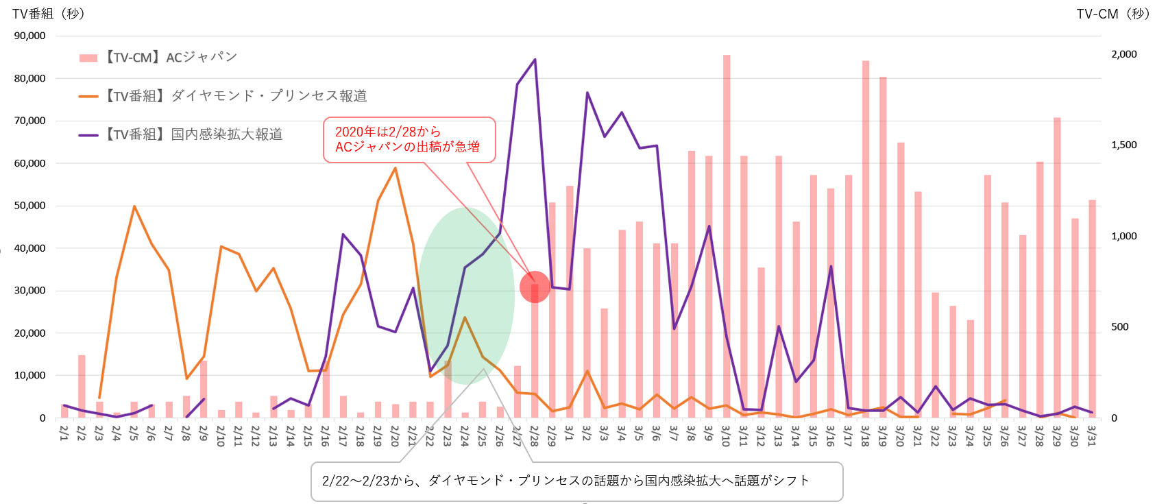 ACジャパンCMは「国内感染拡大」報道が増えた2/28より出稿急増。