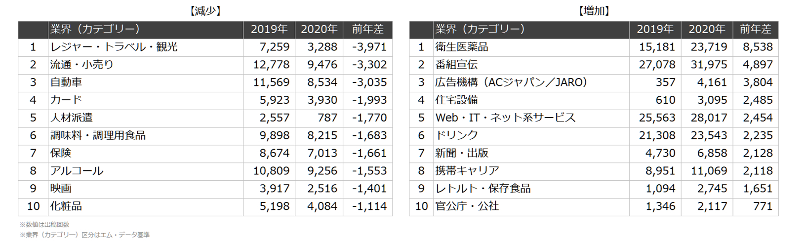 調査方法:エム・データの基準によりカテゴライズされた業界(カテゴリー)区分を、TV-CM出稿回数で集計し前年と比較