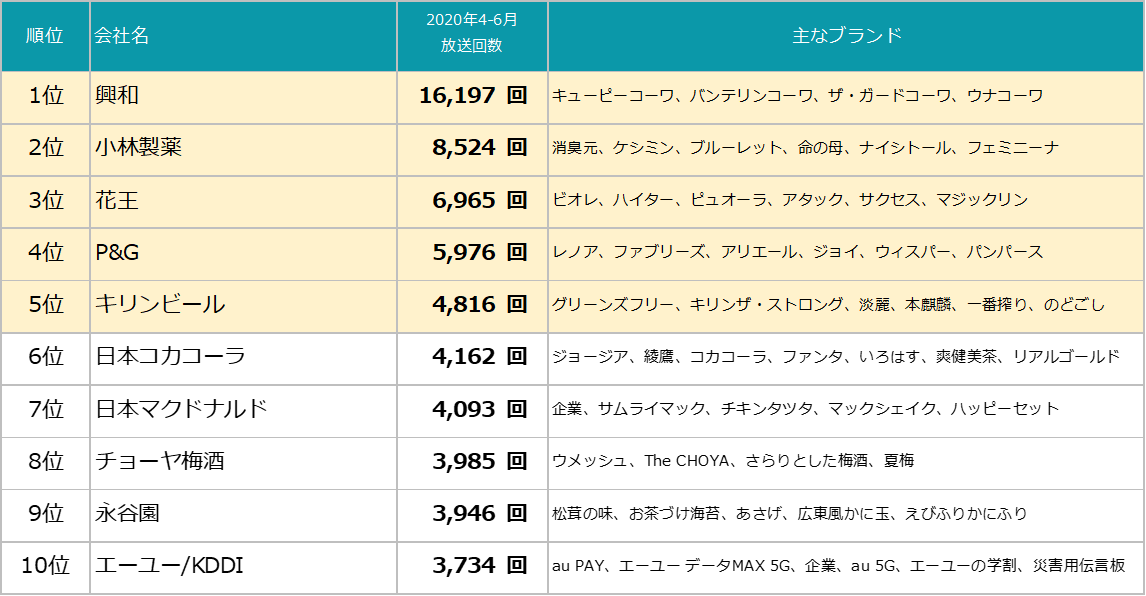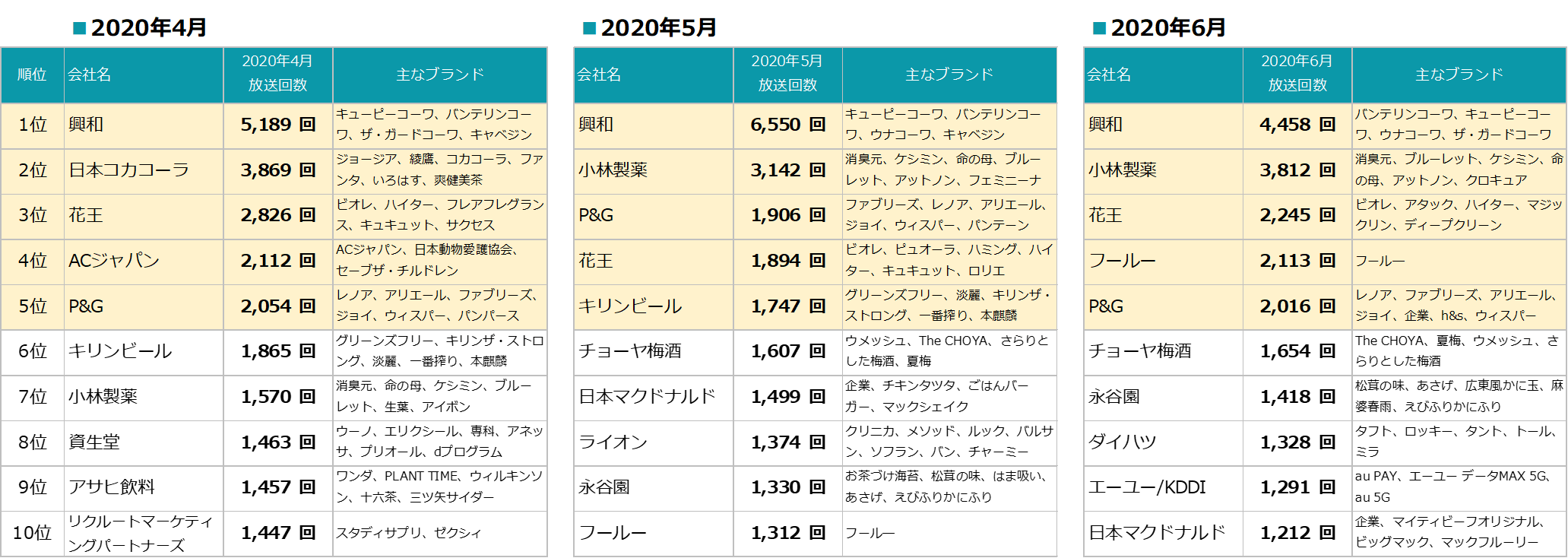■2020年4-6月TV-CM放送回数ランキング(総合)