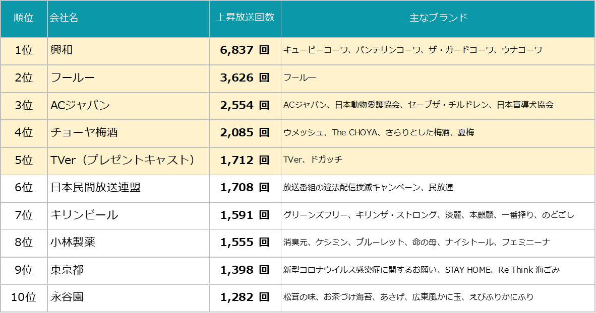 「フールー」「チョーヤ梅酒」「TVer(プレゼントキャスト)」「日本民間放送連盟」「キリンビール」「小林製薬」「東京都」が新規ランクイン!