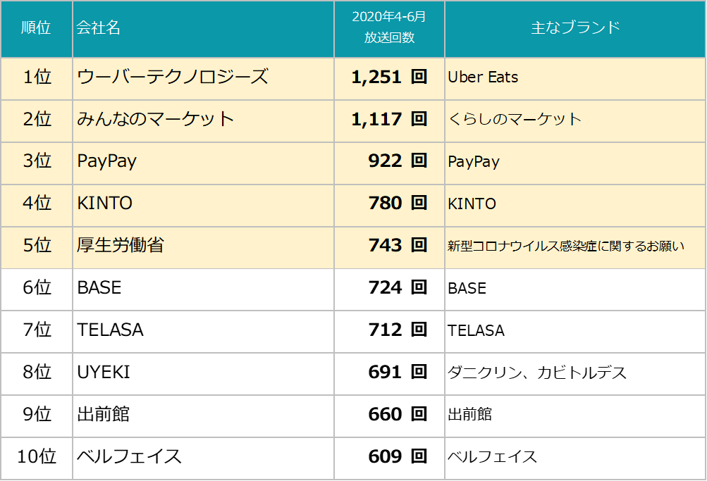 2019年4-6月のTV-CM放送回数と比較し、2020年4-6月での上昇数によるランキング。