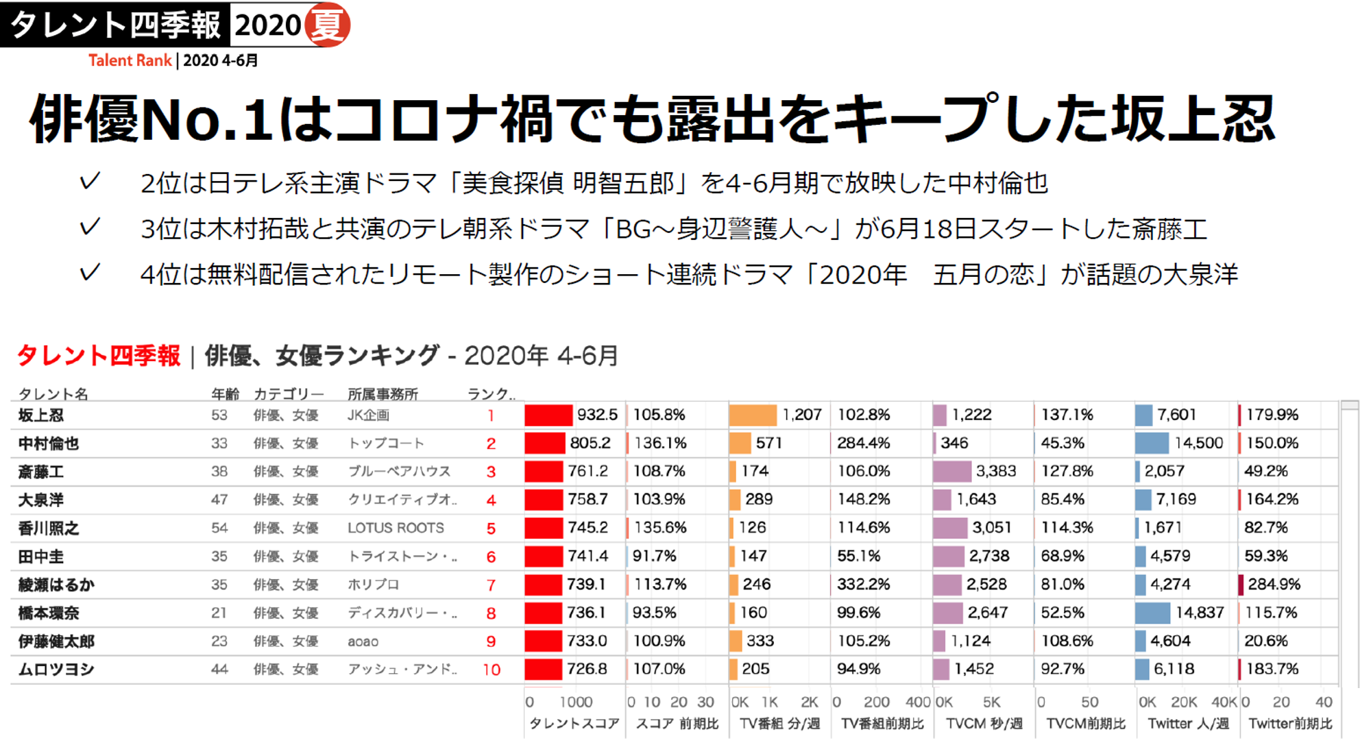 「タレント四季報 2020年夏(4-6月号)」での、TV番組出演、TV番組での話題、TV-CM出演、ツイートされた数を総合したスコア(タレントパワーを示す独自指標)のカテゴリー別ランキング「俳優女優」の上位TOP3は、坂上忍、中村倫也、斉藤工となり、1位の坂上忍は、「バイキング」をはじめとしたバラエティ番組に出演し、コロナ禍でも1位をキープ、2位の中村倫也は、ドラマ「美食探偵 明智五郎」の主演でTwitterでも話題に。3位の斉藤工は、ドラマ「BG~身辺警護人~」への出演をはじめ、8社のCMに出演し3位となった。