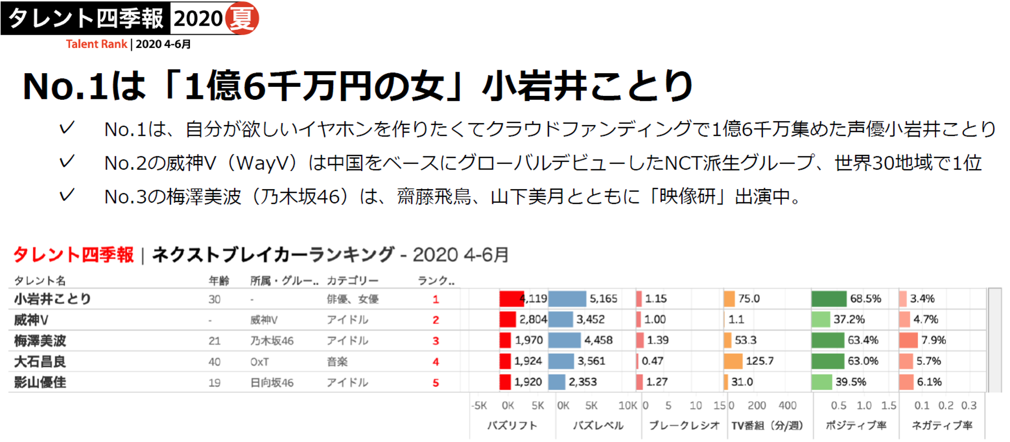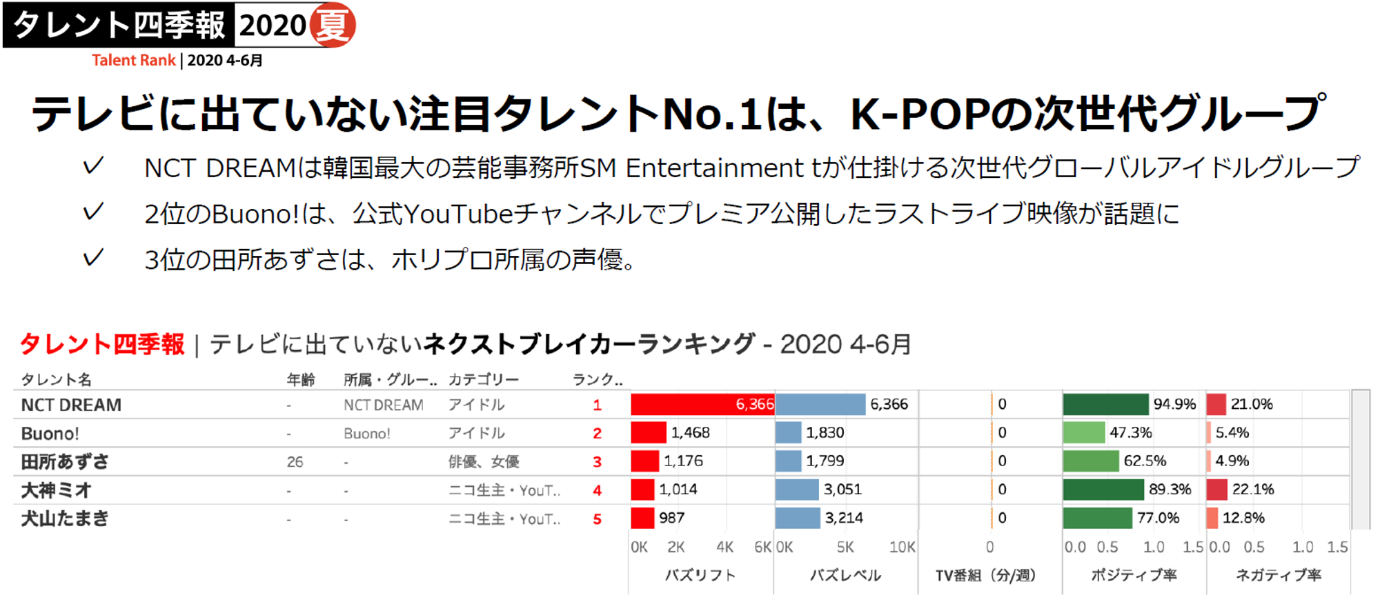 テレビの放送内容をテキスト化した「TVメタデータ」を提供する株式会社エム・データ(本社:東京都港区、代表取締役: 関根俊哉)と、エム・データ内のビッグデータ解析プロジェクト「ライフログ総合研究所(Life Log Lab. 略称“L3”)」(所長:梅田仁)は、タレントパワーを可視化する「Talent Rank(※1)」から、四半期毎にレポーティングするサービス「タレント 四季報 2020夏(4-6月号)」を発表し、販売を開始しました。