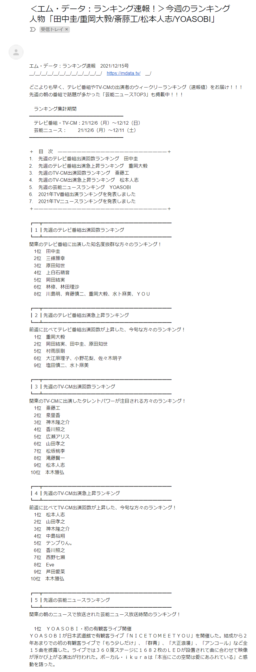 ・以上に同意いただける方は、こちらのボタンより問い合わせページへ移動いただき、必要事項を記載、またお問い合わせ内容欄に「タレントランキング速報購読希望」と記載の上、お申し込みください。