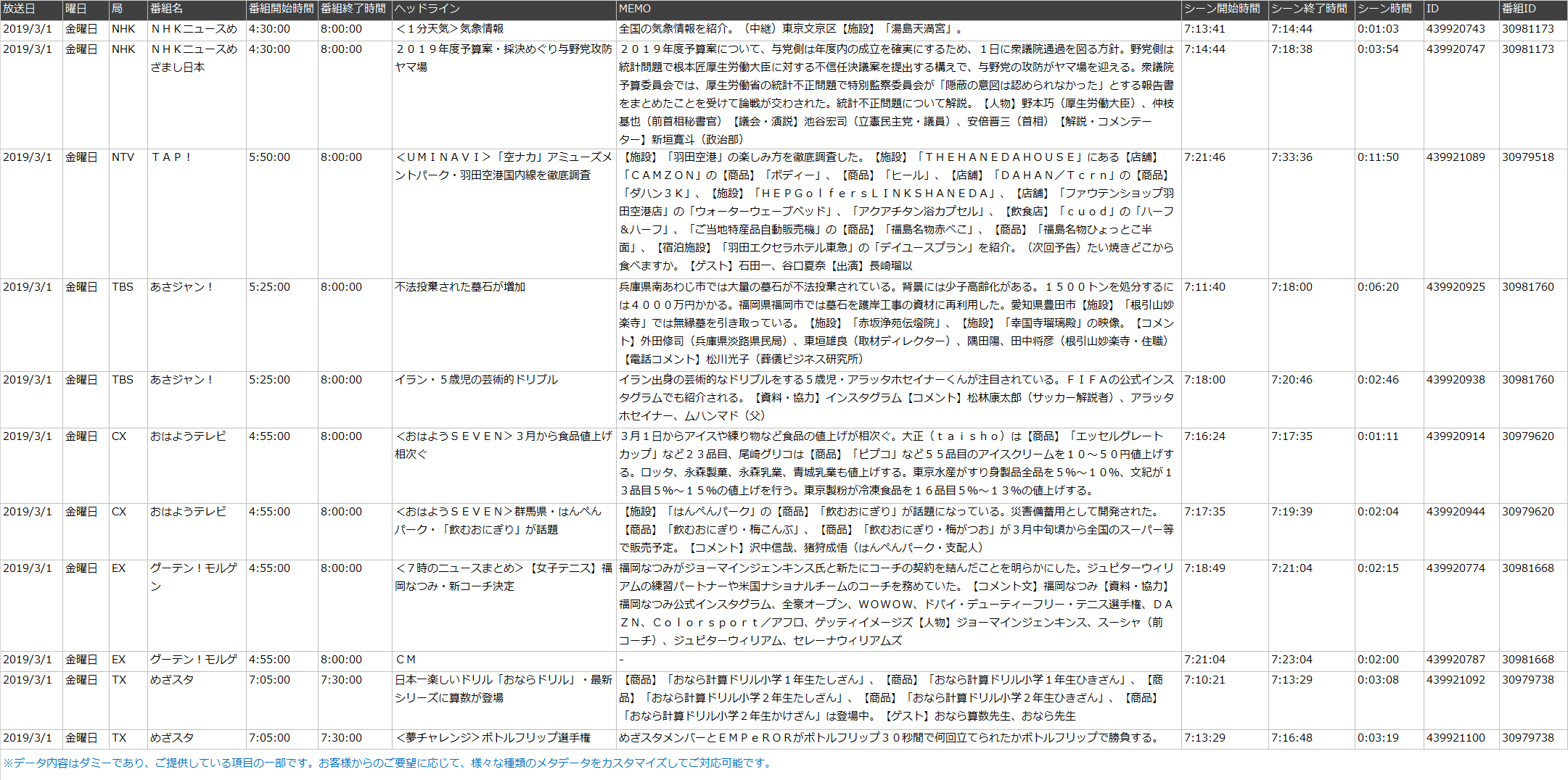 出演しているタレントや使用されている楽曲等をテキスト化したデータ