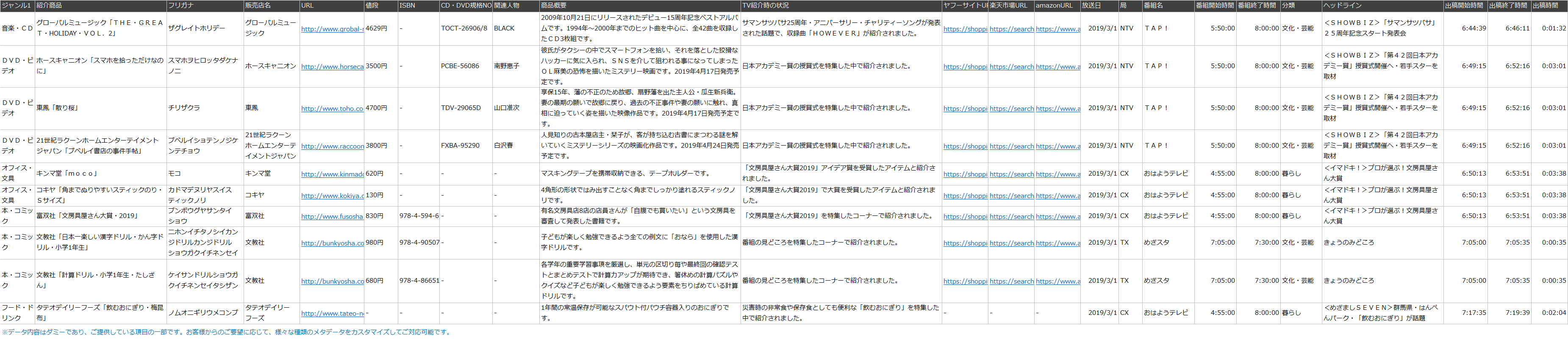 テレビ番組内で紹介された商品情報(紹介商品が購入できるECサイトのURL等)のデータ