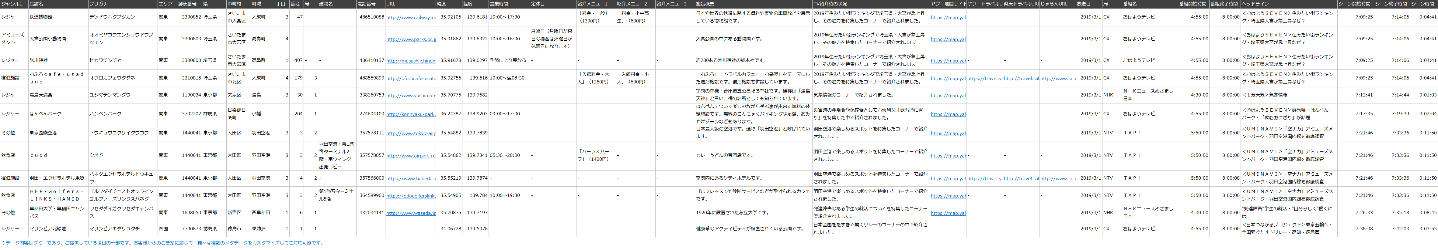 テレビ番組内で紹介されたお店・施設情報(お店・施設の緯度経度情報等)のデータ
